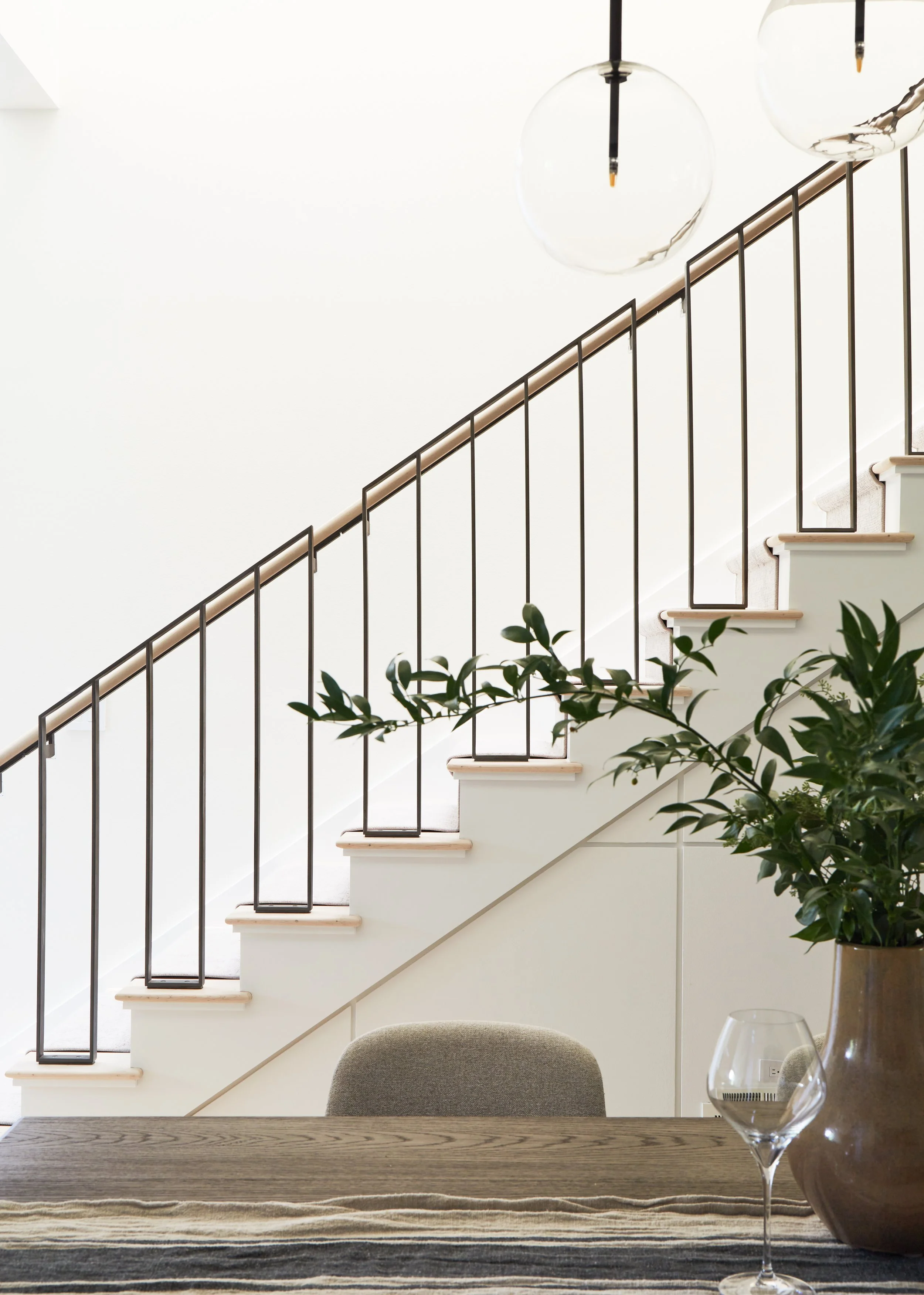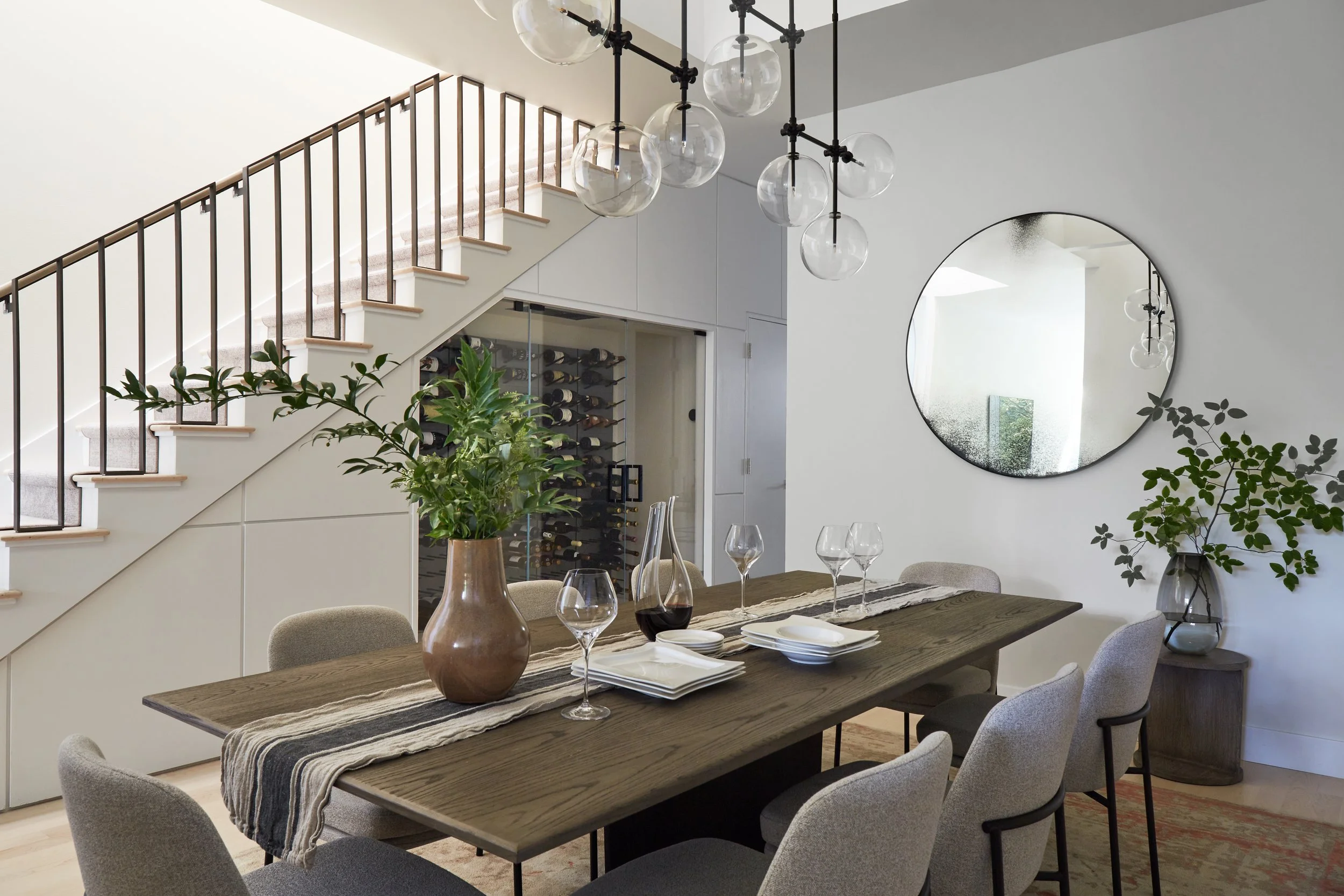 Keeping the identity of this 1890s townhouse contemporary accents and an eclectic mix of art and accessories were added. Each space features a custom component such as the blue built-in shelves and cabinets, the custom designed marble fireplace in the Living Room and the under stair storage units in Hallway.